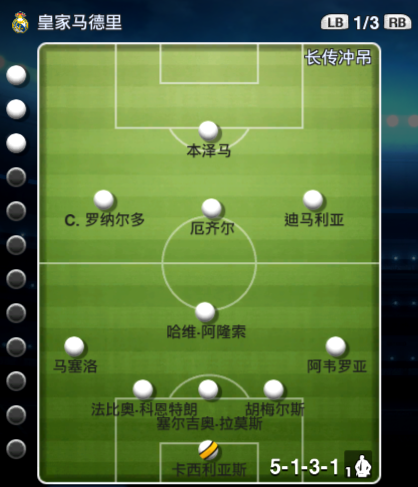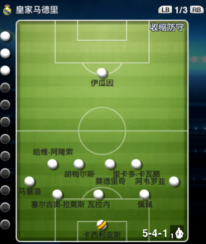遇到弱队我一般都练习控球和传球。中场基本被我占据。因为我方和对方都密集在中场,所以对方给“沙拉维和伊瓜因”扯出了一定的边路突破空间。下底传中有足够的人员抢点,45度传中,有”本泽马“的抢点和“莫德里奇和罗伊斯”的禁区外大脚轰门。这个阵型打的得心应手。