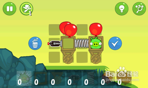 在每个关卡的开始,玩家需要把一些道具(比如、火箭、螺旋桨、发动机、气球、降落伞、重物)加入到框架中组装成载具,以便把小猪从点起点运到终点。