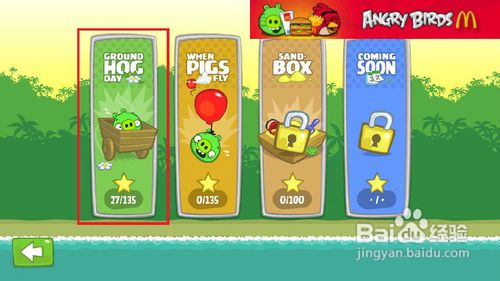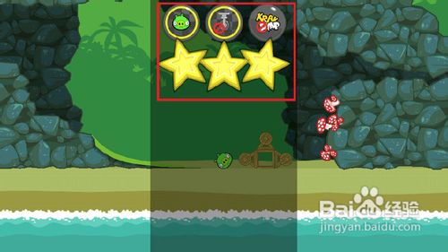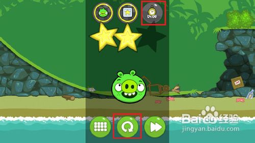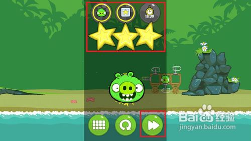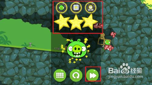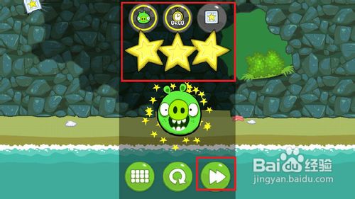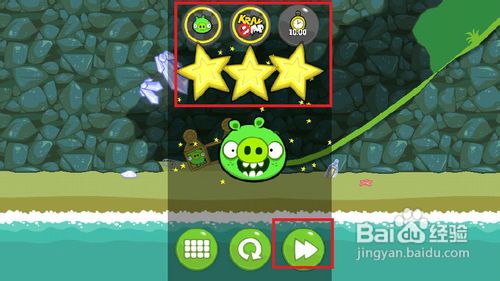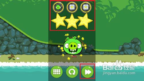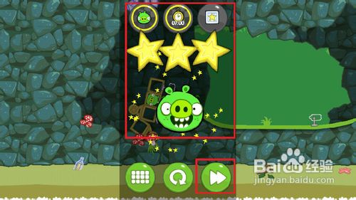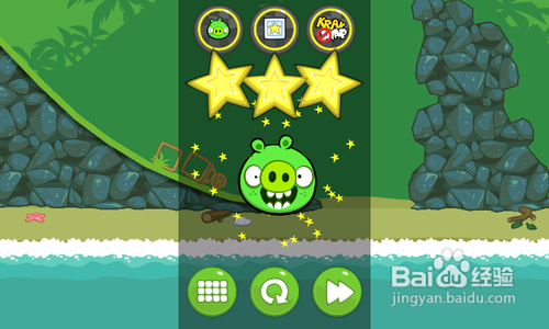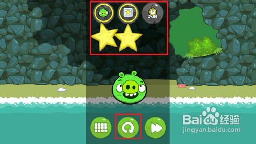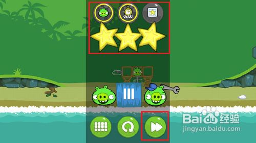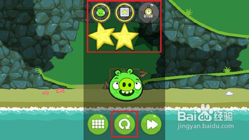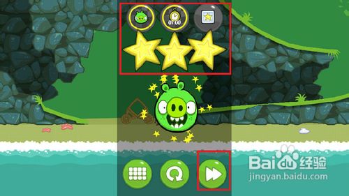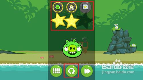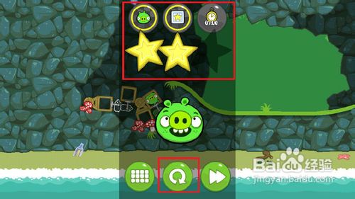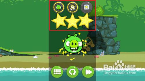 过关之后,会给出三个星星的评价,如下图所示,第一个代表猪头到达目的地,第二个代表获取五角星,第三个代表在指定时间内完成关卡。如下图,没有获取第三个星星,那可以重新开启本关,单独获取第三个星星: