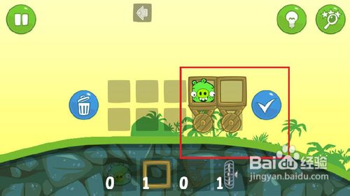 第三关:如下图所示的排各个部件,然后单击对勾,分别按向左和向右的图标,即可推动小车移动。直到过关: