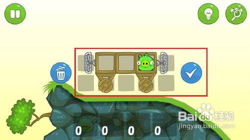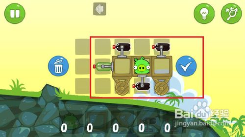 第8关:如下图所示的布置各部件,即可让小车顺坡而下,并获取三颗星(需要注意的是,如果没有获取三颗星,尽可以再次同布局的让小车跑一次):