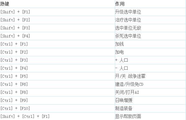 开始Skirmish模式,当在选择GAME OPTIONS时,\"Allow Cheats\"必须选择是,玩的时候按[CTRL] + [SHIFT] + [~]开启命令台: