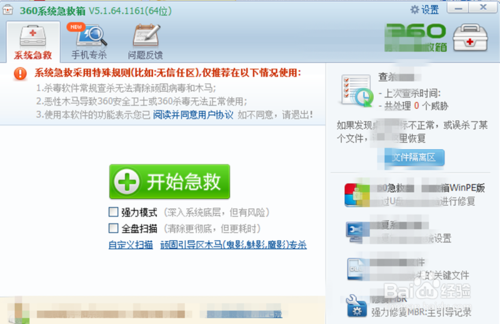 360急救箱是当你电脑已经感染了木马,并且导致360安全卫士无法安装或者启动时,使用该软件进行木马查杀和修复。但是如果电脑并没有出现如系统缓慢,蓝屏等现象,建议不要使用360急救箱,否则可能会出现误杀系统文件,甚至导致死机等不可预料的后果。不能把360急救箱做为杀毒软件用,且用且珍惜!!