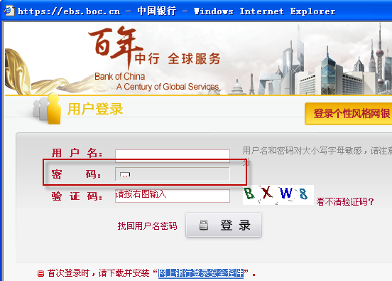 如果没有安装中国银行网上银行安全控件,将输入不了密码。所以用户首次登录时,请下载并安装“中行网银安全控件”。每次使用网上银行的服务后,请点击页面右上角的“退出”按钮退出。