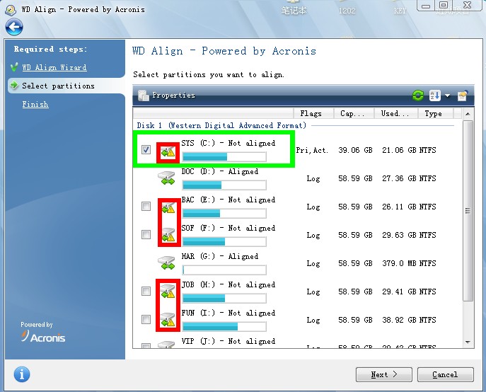 9,如果您的硬盘分区存在4K/扇区未对齐情形,则在相应的分区图片上出现黄色叹号,此时您可以在勾选相应的分区进行对齐操作。(不需要对齐的分区,则无勾选框出现)。勾选完毕后,点击“Next”进行下一步操作。