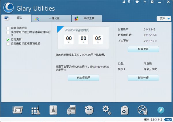 Glary Utilities是一款界面美观,操作简单的系统工具包,该工具包提供了大量能强大的系统工具,涵盖系统优化、管理、保护和加速的所有功能,您可以利用它来进行系统垃圾文件清理、上网记录清理、查找重复文件、优化内存、清理无效快捷方式、管理系统自启动项、卸载软件等等优化操作,让您的电脑运行速度大幅度提高。