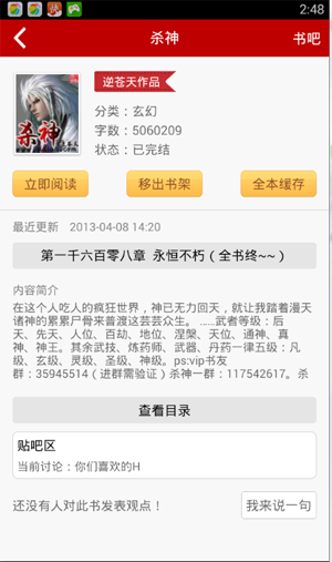 4、这时就跳转到了,这本小说的详情页面,在这个页面你可以缓存这本小说,也可以查看它的目录等,如图所示: