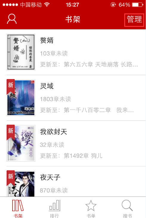 2、在快读小说主界面,点击右上角的管理,如图2所示