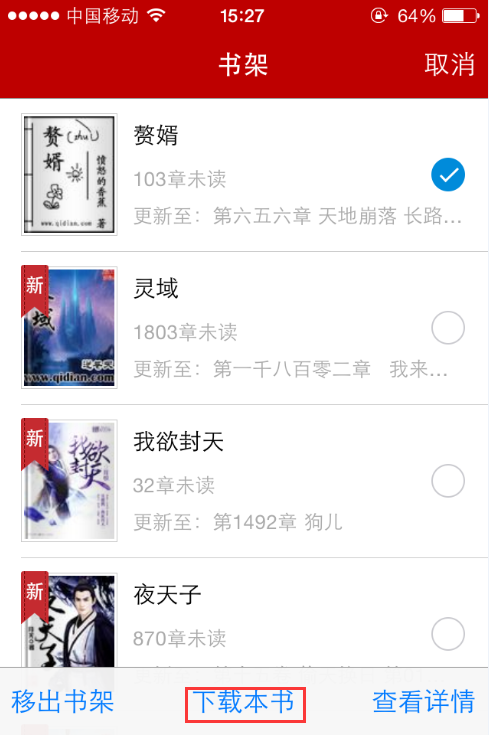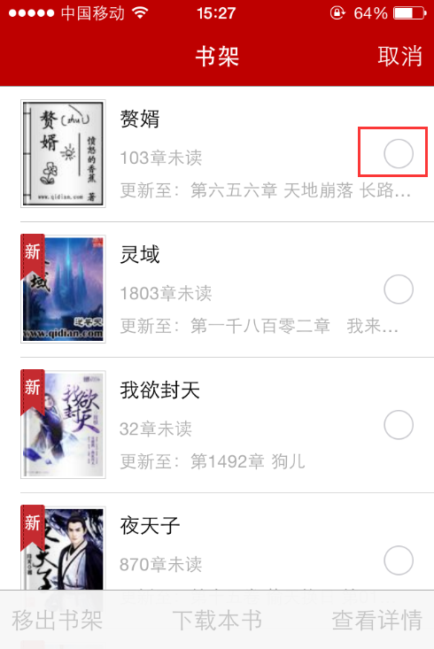 3、选择你要下载的小说,点击小说右边的“圆圈”,如图3所示