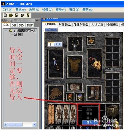2.物品导入:打开.d2s文件后在方格处点右键-输入-选取物品文件(.d2i)请注意导入的物品版本一定要与存档版本一致,通过设置-默认D2I版本更改.