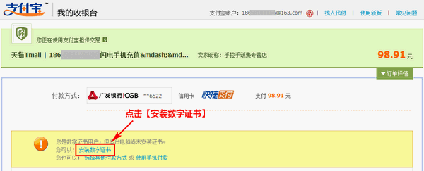 1)如果账户申请了数字证书,在别的电脑上使用余额、已签约的快捷支付、余额宝等方式支付时就需要安装数字证书;可以按页面提示点击【安装数字证书】;