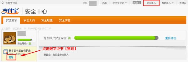 2)也可以直接登录支付宝,在【安全中心】,数字证书【管理】页面,点击【安装数字证书】;