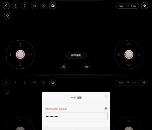 首先我们需要通过Wi-Fi让米兔遥控小飞机APP和米兔遥控小飞机进行连接。米兔遥控小飞机的连接非常简单,首先确保手机的Wi-Fi已打开,点立即连接,只要产品处于开机状态,米兔遥控小飞机APP就会搜到它,然后输入密码,默认的密码为123456789,后期我们也可以进行修改。不过在连接时出了个小问题,就是输入密码后点击连接无反应,这个问题也很好解决,我们只需要打开手机的WLAN列表,找到产品的Wi-Fi名称,然后点击输入密码进行连接就可以了。