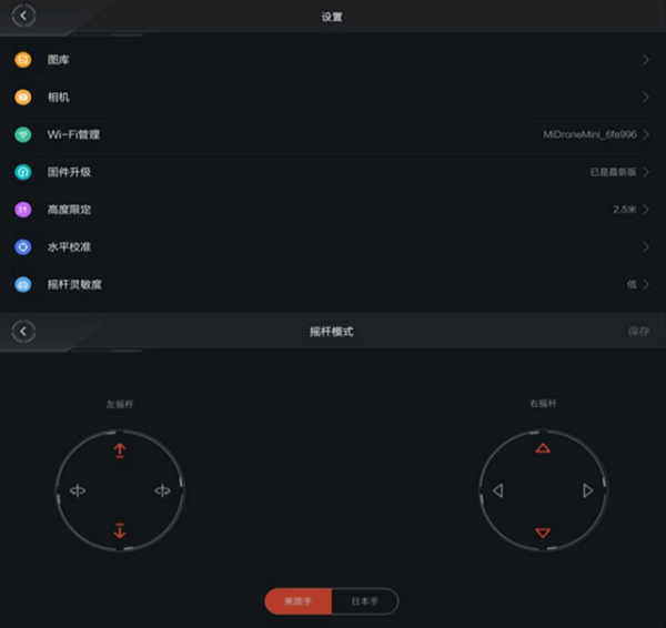 在这里也多说几句,我们可以点击操纵页面右上角的设置按钮进行一些设置的更改和调节,还能查看拍摄的照片和视频。这里我们可以更改摇杆模式,更改对它的限飞高度(最高25米,默认为2.5米),变更照片和视频的拍摄清晰度,进行水平校准口和更改摇杆灵敏度等。