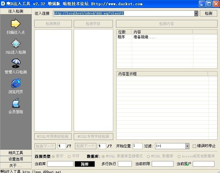 2.打开啊D注入工具,选择“注入检测”的“扫描注入点”子项