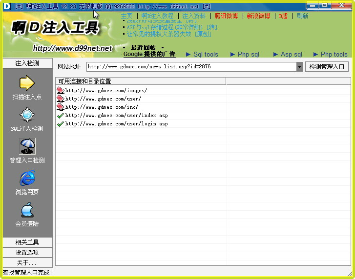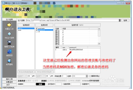 10.选择“注入检测”的“管理员入口检测”,单击“检测管理员入口”,然后选择一个匹配的链接输入检测到的内容即可进入。