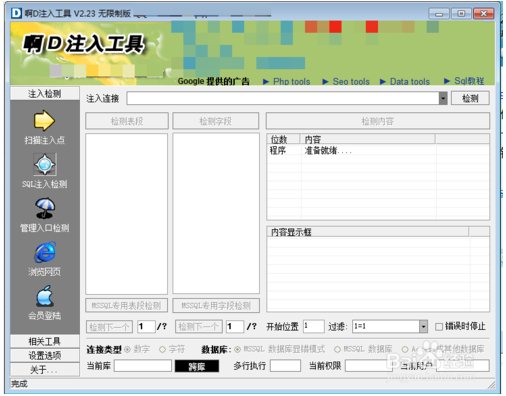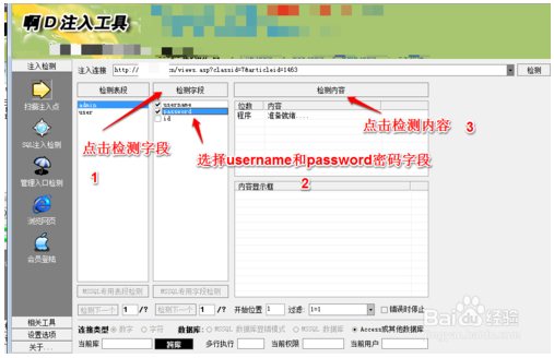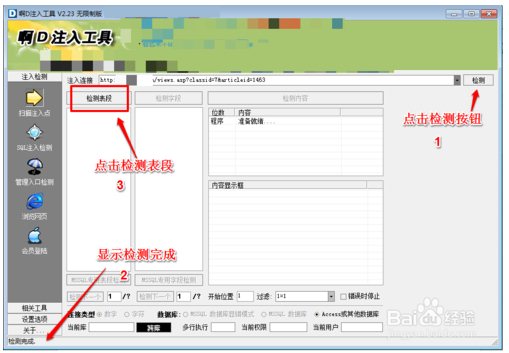 进入注入检测页面,直接点击“检测”按钮,等待左下角会显示检测完成,然后再点击“检测表段”