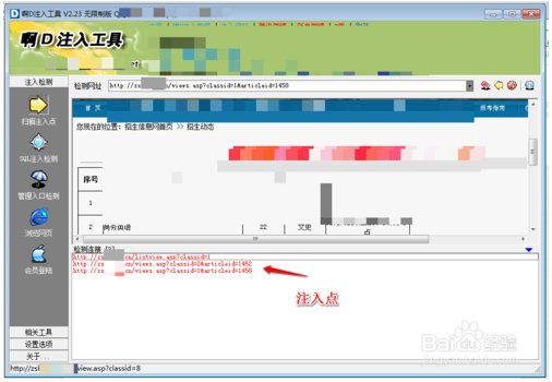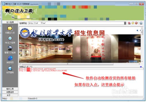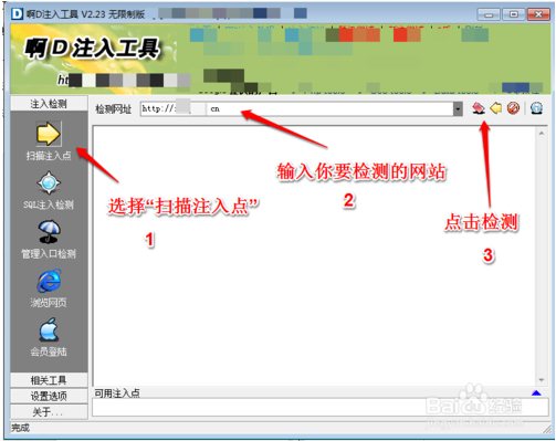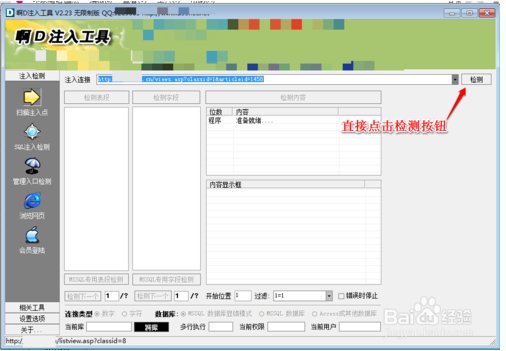 点击软件左边的“扫描注入点”功能,在地址栏输入需要检测的网站地址,点击地址栏后面的检测按钮。