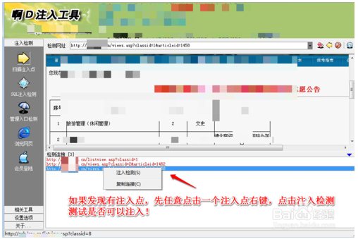 如果检测发现有注入点,可以先任意选择一个注入点,右键选择“注入检测”检测注入是否可用