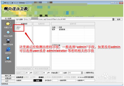 7.单击“检测表段”,此项会扫描数据库中有没有可注入的注册表。若没有,则执行步骤5。直到有可注入 的注册表为止。