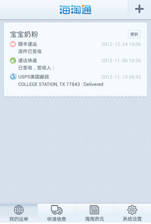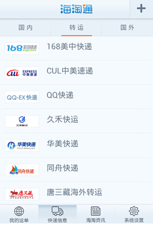 海淘通可以帮你查询你的运单详情,支持查询国内外各大主流快递公司查询以及大部分的转运查询。海淘通支持查询的转运公司、国外快递、国内快递达80多家,内置主流物流公司查询跟踪、最新快递状态自动提醒等便利功能,界面友好,更新迅捷。海淘通便捷的运单查询管理服务,创新的二维码同步快递单号,贴心的物流跟踪提醒,以及全面的快递信息列表展示,将成为你海淘的必备利器。