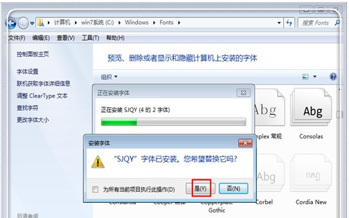 这时候就自动进行字体的安装工作,如果提示有重复的,问是否替换,点击“是”。