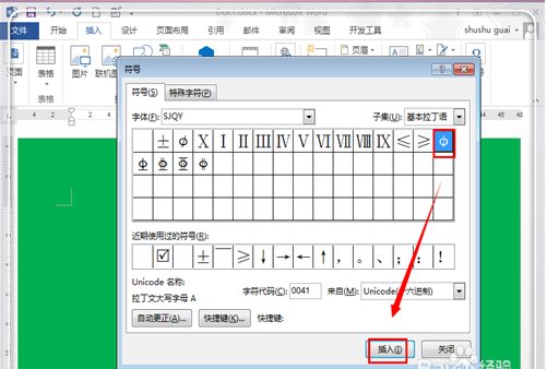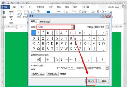 进入到符号插入栏目,在符号后面的方框书输入“SJQY”,然后点击“插入”。