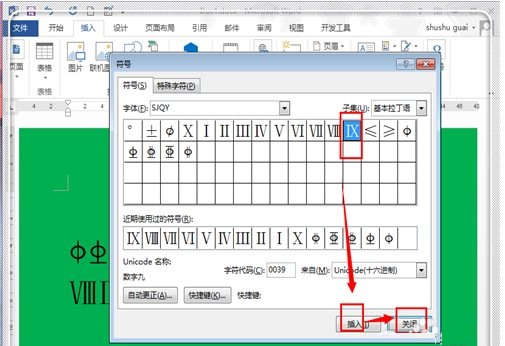 这里如果需要将所有的等级符号插入,点击选中一个,然后点击“插入”,点击完毕之后,点击“关闭”关闭插入窗口。
