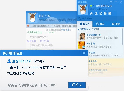 赶集叮咚客户端安装登录后,会驻留在您电脑桌面右下方的托盘中,您不需要打开赶集网页,也能保持实时在线,如果收到客户的问询信息,客户端能第一时间通知您。
