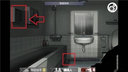 首先我们点击左边的屏幕,进入浴室找寻线索,先检查被害人获得情报,再观察周围的情况。
