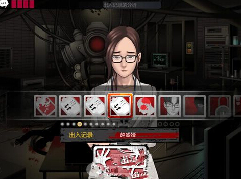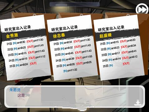 3、现场调查结束之后,警官会将保安系统记录下的被害人以及两个嫌疑人的出入记录拿来,然后发现除了死者,两个嫌疑人的出入记录和平时都不太一样。检查出入记录。在案件情报里面观察一下三个人的出入记录,然后再次审问嫌疑人。