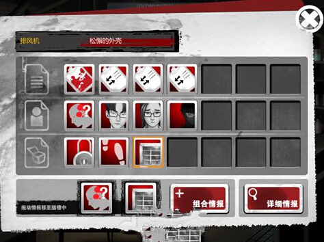 7、然后进入案件情报,将“被掩盖的东西”和“松懈的外壳”组合,可以得到重要情报“排风机”。