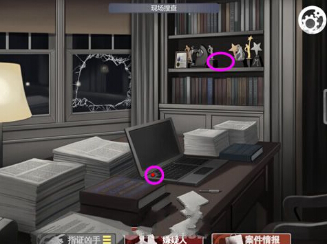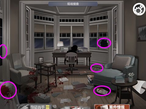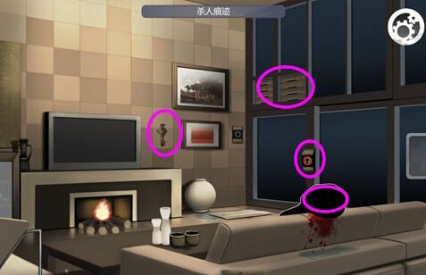 1、调查尸体。通过血迹得到情报【血迹】;点击左边的密码门,发现密码门是被锁,不管是外面还是里面,都需要输入密码才可以打开,得到情报【奇怪的门锁】;点击右边沙发下面的花瓶,得到情报【凶器】;点击右边窗户上的破洞,得到情报【破了的窗户】;点击通过窗户旁的碎玻璃了解凶手是从窗户外链进来的,得到情报【破碎的玻璃碎片】。