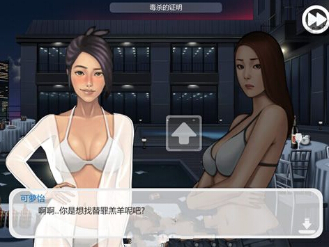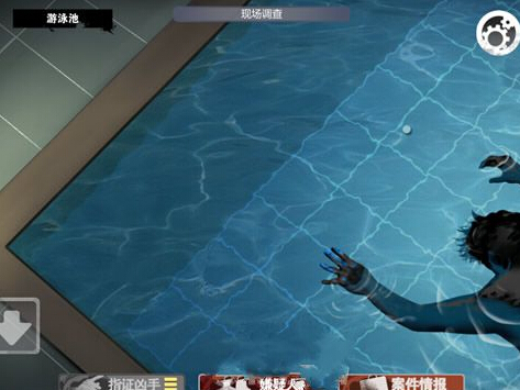 3、之后来到泳池这里,也就是被害人的尸体所在处,之后可以找到一枚纽扣,得到情报“纽扣”。 然后点击被害人的左手,发现手指是蓝色的,说明被害人是被毒死的,之后得到情报“毒杀”。很显然,被害人是中了一种名为河豚毒素的毒,在中毒一个小时后毒 素发作心脏才停止跳动的。而凶手就是三个嫌疑人中的一个,于是开始再次审问犯人。