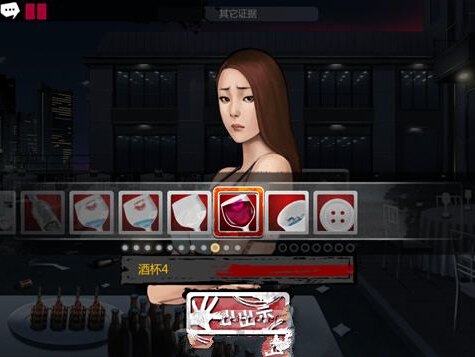 2、渠道现场做调查,首先点击右边的桌子,可以找到被害人和嫌疑人一起喝酒的桌子,之后得到“红酒”以及“酒杯1”、“酒杯2”还有“酒杯3”以及“冰桶”这五个情报。