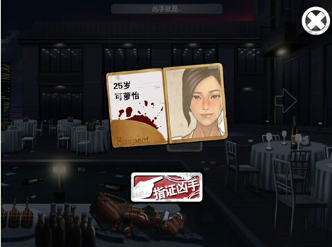 9。 到了揭穿真相的时候啦,凶手是可萝怡。选择“冰块”,然后出示“酒杯3”“酒友”和“目击者”等证据即可。