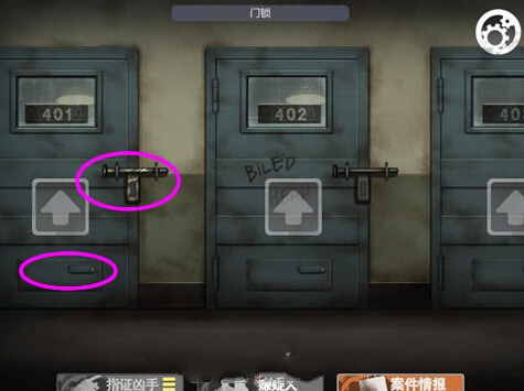 2、进入犯罪现场调查证据。首先点击401房间的挂锁,发现上面有非常多的刮痕,得到情报“刮痕”。 然后点击最下面送饭的小门,发现在小门里面,有一些残留物,得到情报“黏糊糊”。
