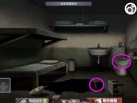 1、进入403室,先把尸体放下来。然后调查尸体的脖子得到“两道勒痕”的信息,然后调查坐厕得到“绳索”的信息。然后进入案件情报,将“两道勒痕”和“绳索”组合在一起,得到“杀人工具”;狱警会告诉你,这牢房是不需要钥匙的,只需要使用挂锁就可以锁起来,也就是说,只能从外面打开,而不能从里面打开。