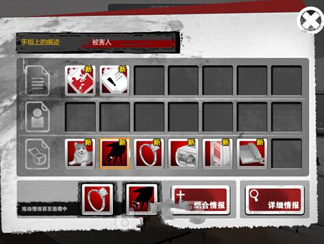 这时我们需要打开屏幕下面的案件情报,然后把有关被害人的案件情报与凶器组合, 得到新的案件情报:嫌疑人是熟悉的人!