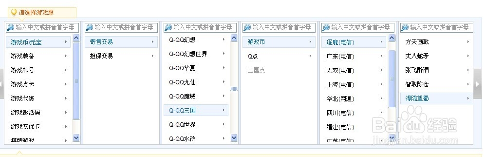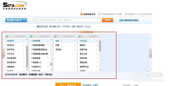 第三步:在搜索框中输入您想要购买的游戏商品名称,点击“搜索”按钮;或者点击一个类目,就会列出此类目下的很多子类目。