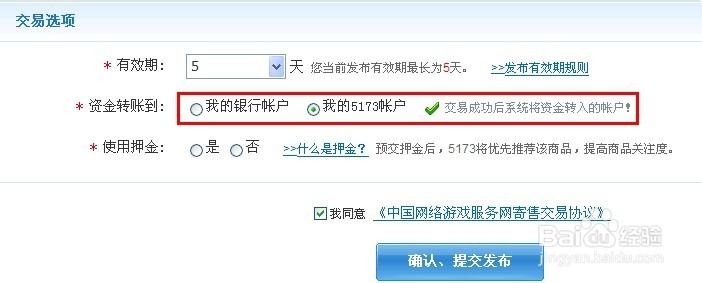 然后交易选项里面我们可以选择到我的5173账户, 或者是直接达到你的银行卡.点击银行卡的话需要绑定你的银行卡号, 5173貌似只支持五大银行! 选择完毕提交就可以等待别人购买啦.