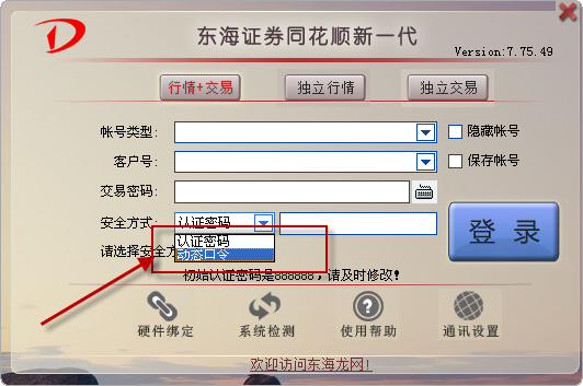 单击独立行情,即可进入行情系统。行情+交易、独立交易进需要在“客户号”一栏输入您客户号、交易密码,选择对应的安全方式并输入相关口令或密码,点击登录即可享受到我们提供的各项服务。硬件绑定:将客户端机器的硬件信息与客户号做绑定,禁止改客户号在其他机器上登录,增强安全性。