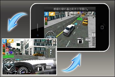 对于科场地考试,运用逼真的3D技术,把驾校场地考试各项目设计成游戏关卡,如倒桩,单边桥,坡道起步,侧方位停车等项目,对于每个项目提供了演示和游戏操作,演示采用3D技术显示过关步骤和过关要点,学员可以从不同角度观察学习,在游戏中玩家可以通过触摸屏直接操作方向盘,油门,刹车离合来通关。在游戏中得到乐趣的同时,也对汽车操控,方向感,车感有相当的帮助。对于科路考,游戏把一些常见的开车上路的技术设计为三维游戏关卡,如路口拐弯,红绿灯路口,弯道掉头,汇入车流,借道,超车等项目。在考试中把所有的场地考试,路考的内容表现为游戏关卡,玩家可以一关一关的攻克。