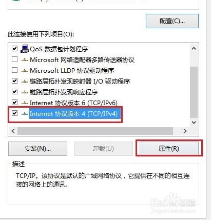 选择”internet协议版本4(tcp/ipv4),点击“属性”