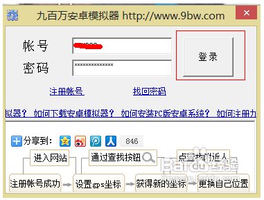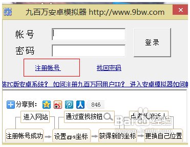 打开九百万安卓模拟器。需要是注册的用户才可以使用,如果你之前注册过了,请直接登录,没有注册过的,需要点击注册账号注册一个。