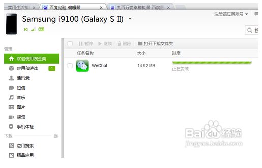 然后就可以安装软件了,打开豌豆荚会自动连接九百万安卓模拟器,连上之后尽情安装软件吧~