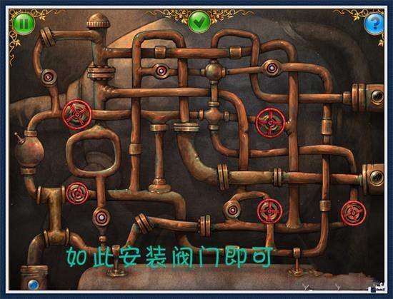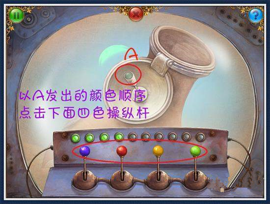 16、回一层,放入管道和齿轮。在右边机器处放入灯泡,开始谜题。(图4)点击操作杆和左下方的红色按钮,进入。