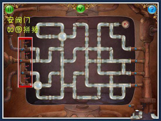 10、上来左行一步,找到6个小球。放入阀门开始谜题(图12)点击上方灯闪处。找到1个操纵杆