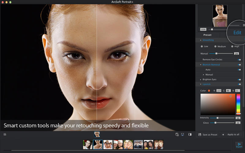 用简单的点击,Portrait+ 可以改变肖像皮肤美丽程度,使用预先设定的模板使皮肤光滑,增强眼睛等。