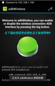 1、打开手机端的“adbWireless”软件,点中间的灰色按钮,当变成绿色后说明程序启动成功;